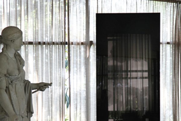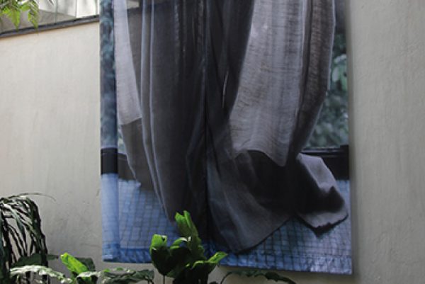 Na parte externa, a artista explorou ainda materialidade do tecido, com a obra “Velário”, um grande cortina com impressão fotográfica, que cobriu a única parede externa do átrio, visível dentro e fora da casa a partir de diferentes ângulos e formas..
