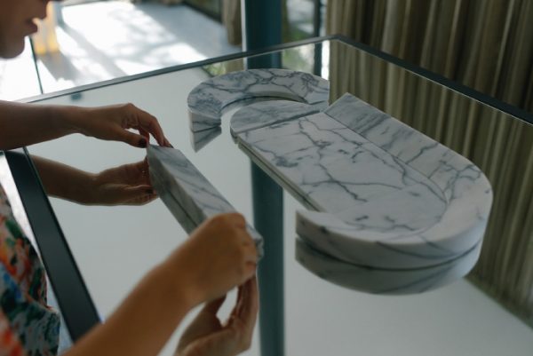 Ao todo foram produzidas 11 peças inéditas para exposição: o aparador, de Fernando Brízio, utiliza o peso do mármore para criar uma superfície de fios de poliéster tencionados; o conjunto de recipientes, criados por Miguel Vieira Baptista, tem inspiração nas ruínas arquitetônicas romanas; Mestiço, obra de Humberto e Fernando Campana, revelam a dureza do mármore em anéis ao delicado adorno de capacho de fibra de coco; Alpinina, tigela produzida em calcário por Jasper Morrison, parece flutuar a partir do desenho arrojado de sua base; Fontaine, delicada fonte d’água criada por Ronan e Erwan Bouroullec; Forbidden Fruit, três recipientes nos quais Michael Anastassiades joga com as diferenças cromáticas dos mármores; Mancebo Angras,inverte a visualidade dos mancebos tradicionais criando ganchos a partir de recortes ao longo da peça de mármore, e Bowl Compass, que mistura o calcário português à madeira do ipê-roxo brasileiro, ambos projetos de Claudia Moreira Salles.